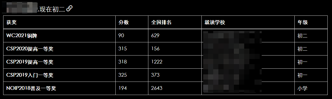 这才叫差距 发表于 2021-03-28 分类于 日记类 这才叫差距 给不知道的朋友解释一下noip普及组、提高组在2019年分别更名为csp普及组、提高组。noi是省选代表在同一地点代表省参加比赛,noip多的p代表in provinces,是省内比赛,两个不一样。普及组一般为初中生参与,提高组一般为高中生参与,wc是冬令营(不是厕所) 更多内容可以在这里了解。 me: 某大佬: 感谢您的支持! 打赏 微信支付 本文作者: A Mirror 本文链接: https://www.amirror.top/2021/03/28/chaju/ 版权声明: 本博客所有文章除特别声明外,均采用 BY A MIRROR 许可协议。转载请注明出处!