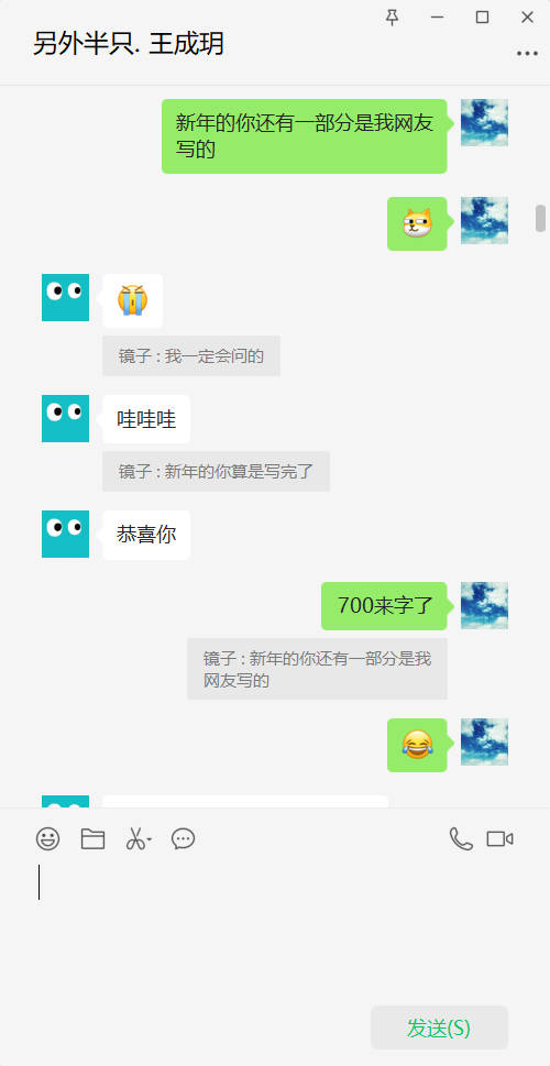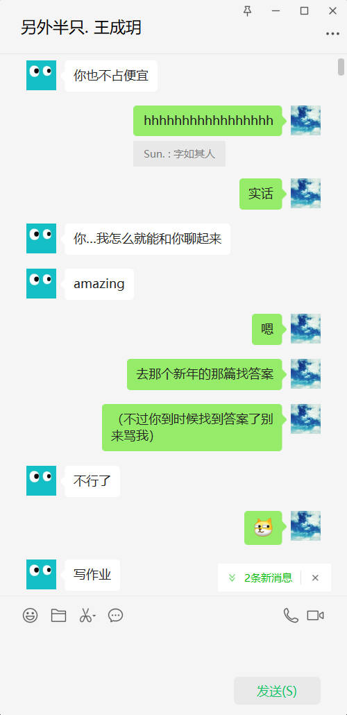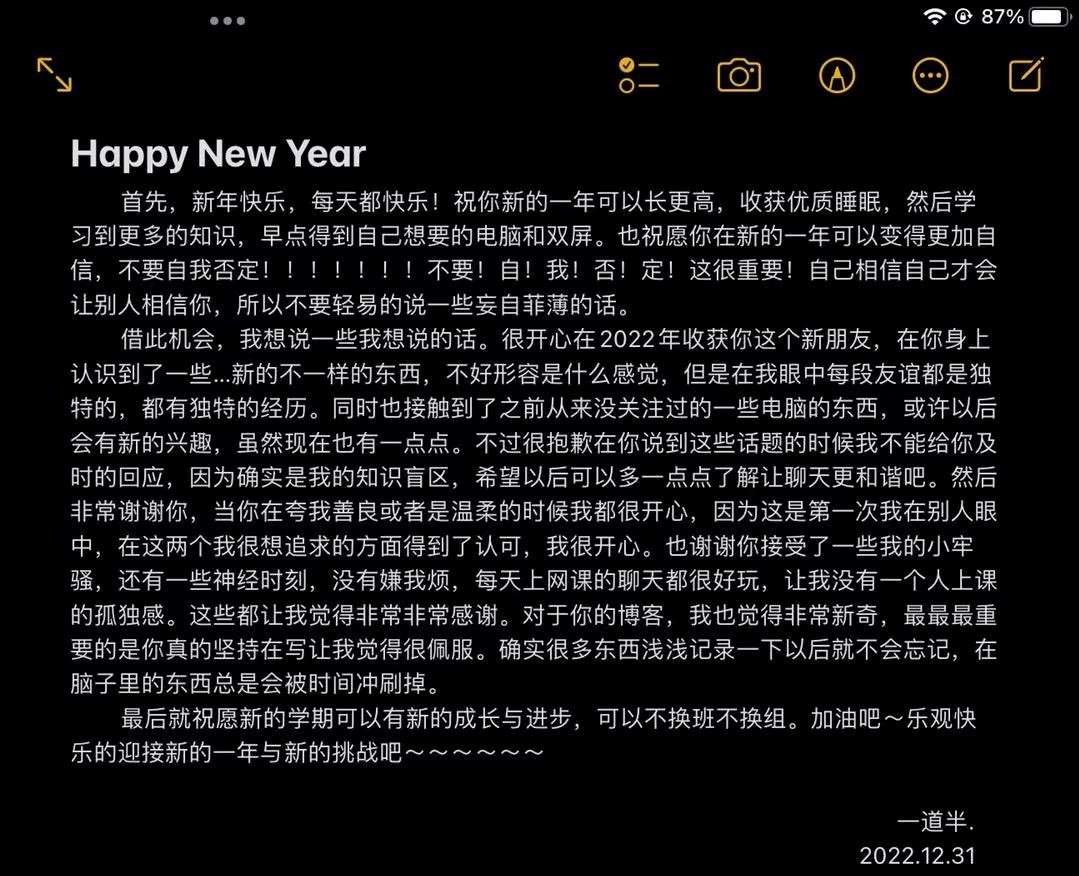 不过你也让我进步了许多。比如从文明用语,不要否定自己,到网课的时候认真听课(不过这条好像和你妈关系更大),早点睡觉,还有其它什么的。完了,又是一到列举的时候就啥也想不出来了,但应该是挺多的。其实上网课的时候,你也让我不是那么孤独,让我觉得不是只有我一个人。不过刚开始好像是你让我文明的,然后结果就真的文明了好多,也不是我偷偷文明不带你啊啊啊啊啊啊。不过你不是本来就挺文明,对你来说,比原来更文明应该很简单吧(我才不承认估计是我把你带坏的)。啊对,这不是你的新年愿望就来了:回归文明🐶。